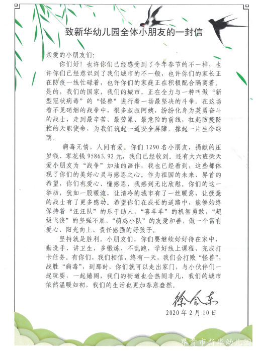 2月11日,新华幼儿园收到一封特别的来信,这封信是界首市委书记徐会东专门写给新华幼儿园全体小朋友的。