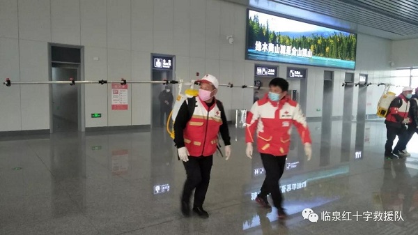 红十字应急救援队员们整装待发,在做好自我防护的前提下,由支部书记徐健带领,志愿者们分工合作,有的背负大型喷雾器,有的疏导周围群众,同心协力依次对候车大厅、站前广场、停车场、出入站口等区域进行了细致的防疫消毒措施。