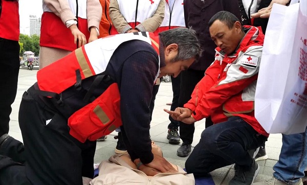 县红十字会应急救援队组织了20多名队员和16名正在参加红十字救护员培训的多个公益组织的社会志愿者,进行了现场模拟教学,讲解急救知识,特别是心肺复苏的实地模拟操作,目的是在日常生活中,能够有充分的能力和操作方法,实施院前急救,更好地挽救患者的生命。2019年以来,他们已经培训了300名伤病应急救护员,培训内容包括心肺复苏、外伤包扎、骨折处理、急救知识等等。