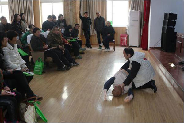 此次培训内容充实,区红十字会的培训讲师张金贺从救护新概念、创伤救护基本技能(止血、包扎、骨折固定及安全搬运)、心肺复苏、常见急症现场处理、突发事件和意外情况现场应对等几个方面,理论知识和图片展示相结合,重点突出,语言生动,并与参训教师开展互动,讲到关键的步骤和动作要领时,不仅有具体的操作演示,还让大家动手操作, 受训老师很快掌握了救护的要领与基本操作技能,