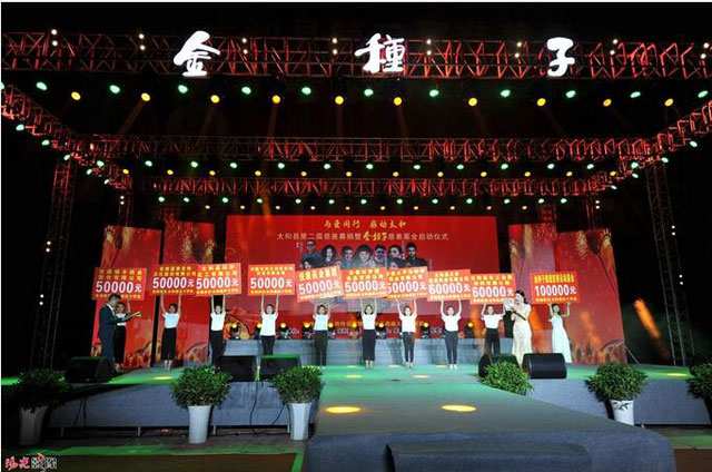 太和县第二届慈善募捐暨金种子慈善基金启动仪式文艺演晚会上,著名主持人阿进、歌手慕容晓晓、星光大道李莉、慈善大使张婷、江苏卫视海量歌神梁山、著名歌手高胜美等在晚会上精彩献艺不断把晚会推向高潮。