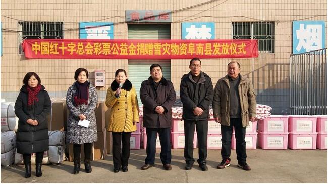 1月30号上午,“中国红十字总会彩票公益金捐赠雪灾物资发放仪式”分别在阜南县城及曹集镇举行。参加仪式的有阜南县副县长、红十字会会长刘丽丽及红十字会全体人员,鹿城镇、中岗镇、曹集镇、王店孜乡的干部和贫困户代表五十余人等,会议由阜南县红十字会副会长薛京梅主持。