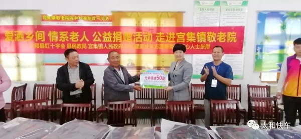 10月3日、5日,太和县红十字会、太和县眼科健康快车志愿服务队志愿者们,在太和县红十字会副会长王玉强、秘书长范士敏等领导的带领下来到双庙镇敬老院、宫集镇敬老院,为住在敬老院的老人们免费送去250件棉衣和光学眼镜550副,并给老人们带去了节日问候。